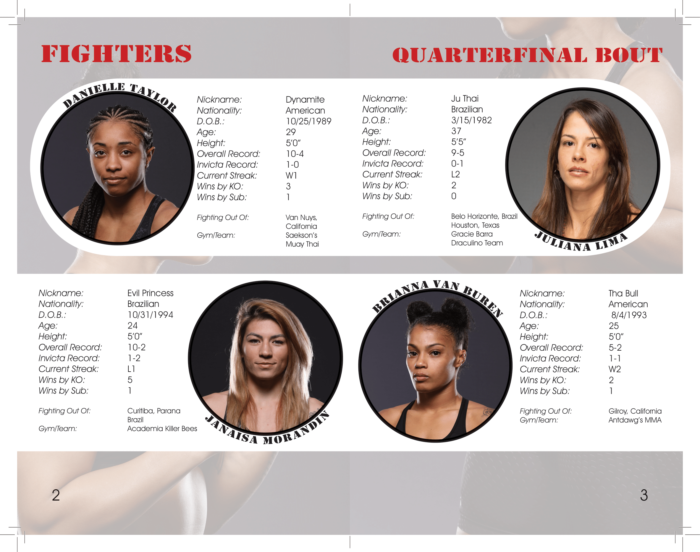 Invicta is a Woman's MMA tournament circuit that I was contracted to create the program for. It contained the information on the fighters as well as paid-for ad space. This was handed out to every attendee at the fights.
